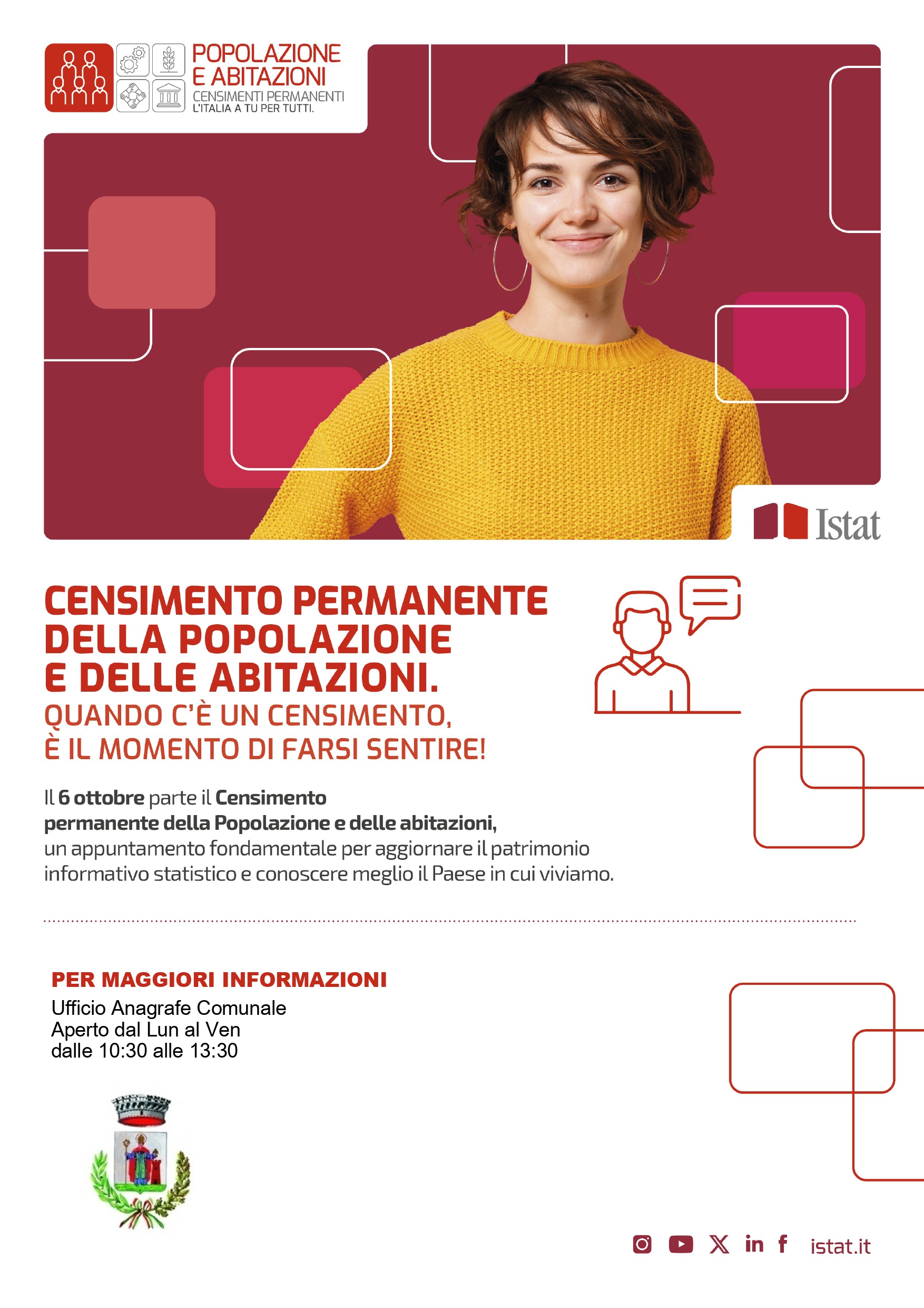 Per informazioni e assistenza è possibile rivolgersi all’Ufficio Anagrafe Comunale, aperto dal lunedì al venerdì dalle 10:30 alle 13:30.